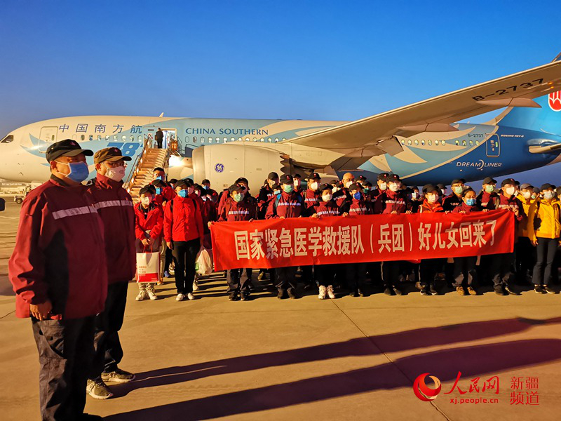 新疆生產(chǎn)建設(shè)兵團(tuán)支援湖北醫(yī)療隊(duì)抵達(dá)烏魯木齊機(jī)場(chǎng)。陳新輝攝