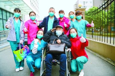 昨天上午,武漢協(xié)和醫(yī)院西院北京醫(yī)療隊(duì)負(fù)責(zé)的病區(qū)內(nèi),一名91歲的老兵孫爺爺康復(fù)出院,與平日里照料自己的醫(yī)護(hù)人員合影時(shí),老兵敬了一個(gè)軍禮。記者 和冠欣攝