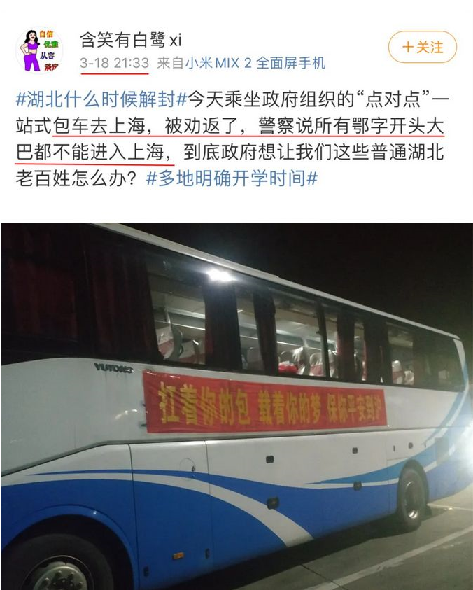 有媒體報(bào)道稱(chēng),3月18日至3月19日,多個(gè)湖北縣市的點(diǎn)對(duì)點(diǎn)大巴包車(chē),到達(dá)上海市附近高速收費(fèi)站或高速公路后,遭遇無(wú)法進(jìn)入上海的囧境。不少返程復(fù)工人員為此等待至深夜,甚至只能在大巴車(chē)中過(guò)夜。
