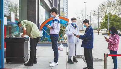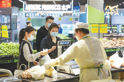 3月22日,在洪山區(qū)中百倉儲(chǔ)光谷購物廣場(chǎng),記者看到超市已經(jīng)恢復(fù)正常營業(yè)。為保障顧客健康安全,超市采取了出示綠色健康碼或社區(qū)健康證明、測(cè)量體溫、每日限流等舉措。據(jù)悉,3月20日,武漢市商務(wù)局通報(bào),根據(jù)武漢市疫情防控指揮部有關(guān)工作組決定,自即日起,無疫情小區(qū)和社區(qū)將有限放行,商業(yè)設(shè)施和商業(yè)網(wǎng)點(diǎn)將逐步有序開放。圖一:顧客正在將蔬菜等商品過秤;圖二:進(jìn)入超市前,顧客正在排隊(duì)登記個(gè)人信息并檢測(cè)體溫。(記者 張武軍攝)