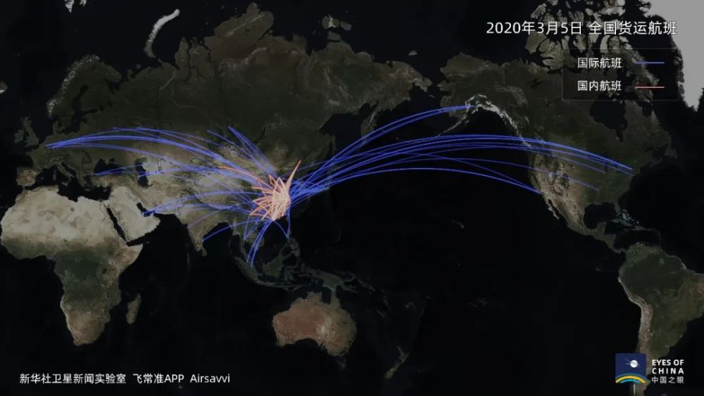 1個(gè)月內(nèi),中國國內(nèi)和直飛世界各地的貨運(yùn)航班快速增多,原有航線航班數(shù)也有增加,標(biāo)示航線的橘色、藍(lán)色線條也就更粗。