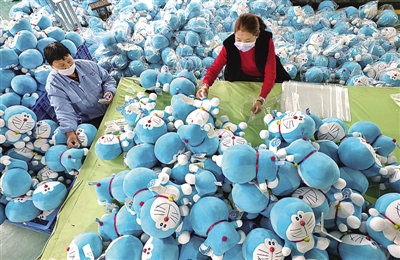 3月25日,山東臨沂沂南縣青駝鎮(zhèn)雙橋村扶貧車間農(nóng)民在加工玩具。杜昱葆攝/光明圖片