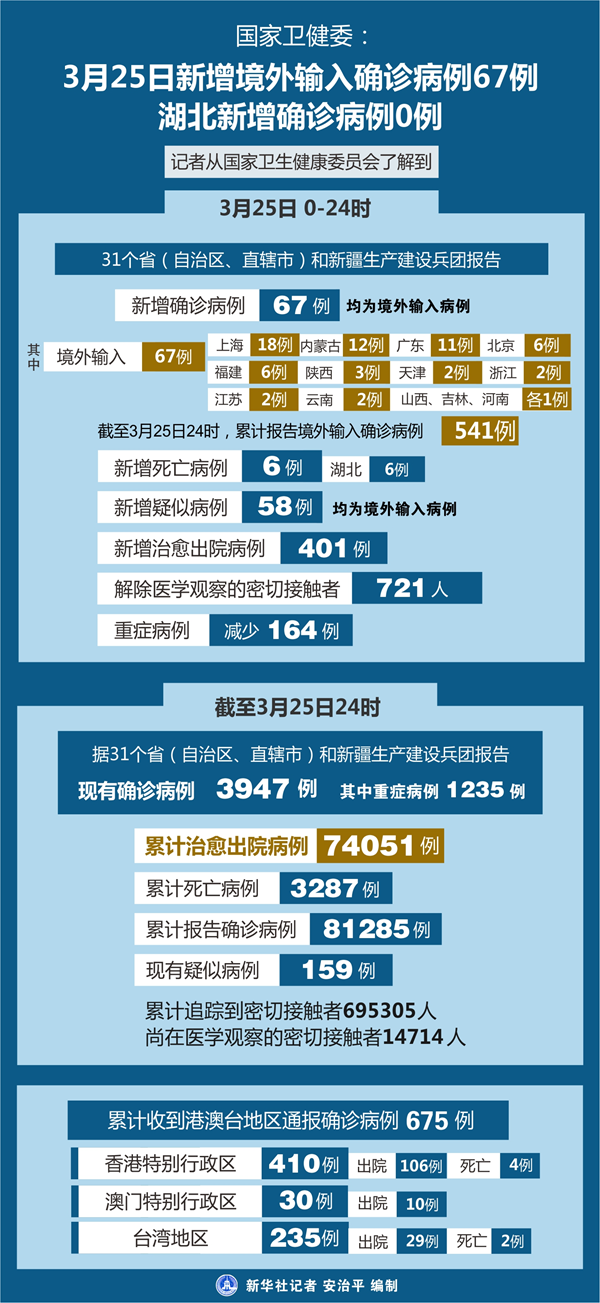 新華社北京3月26日電(記者熊豐、申鋮)記者26日從國(guó)家衛(wèi)生健康委員會(huì)了解到,3月25日0—24時(shí),31個(gè)?。ㄗ灾螀^(qū)、直轄市)和新疆生產(chǎn)建設(shè)兵團(tuán)報(bào)告新增確診病例67例,均為境外輸入病例;新增死亡病例6例;新增疑似病例58例,均為境外輸入病例。