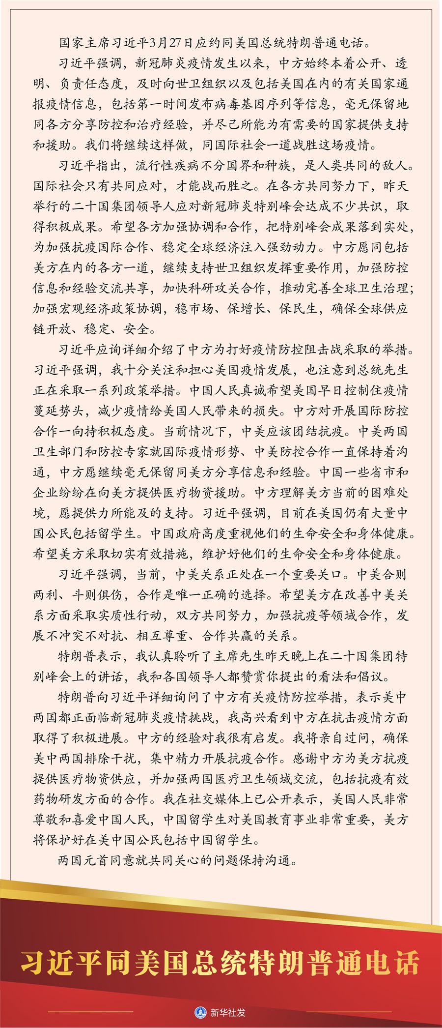 特朗普向習(xí)近平詳細(xì)詢問(wèn)了中方有關(guān)疫情防控舉措,表示美中兩國(guó)都正面臨新冠肺炎疫情挑戰(zhàn),我高興看到中方在抗擊疫情方面取得了積極進(jìn)展。中方的經(jīng)驗(yàn)對(duì)我很有啟發(fā)。我將親自過(guò)問(wèn),確保美中兩國(guó)排除干擾,集中精力開展抗疫合作。感謝中方為美方抗疫提供醫(yī)療物資供應(yīng),并加強(qiáng)兩國(guó)醫(yī)療衛(wèi)生領(lǐng)域交流,包括抗疫有效藥物研發(fā)方面的合作。我在社交媒體上已公開表示,美國(guó)人民非常尊敬和喜愛中國(guó)人民,中國(guó)留學(xué)生對(duì)美國(guó)教育事業(yè)非常重要,美方將保護(hù)好在美中國(guó)公民包括中國(guó)留學(xué)生。