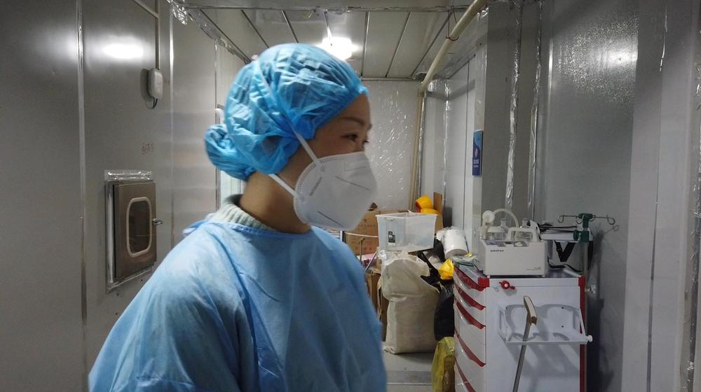 圖為遼寧援助武漢雷神山醫(yī)療隊(duì)隊(duì)員張倩在隔離病房外等待隊(duì)友。