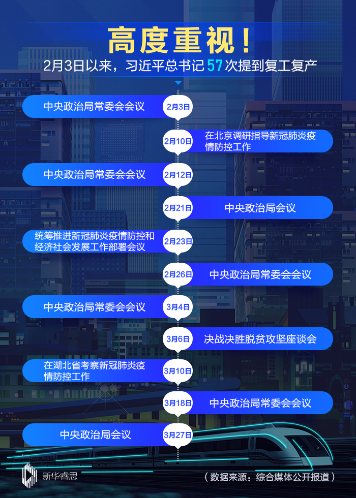 數(shù)據(jù)顯示,自2月3日以來(lái),習(xí)近平在不同場(chǎng)合共提到了復(fù)工復(fù)產(chǎn)57次,足見總書記對(duì)復(fù)工復(fù)產(chǎn)工作的重視和關(guān)注。