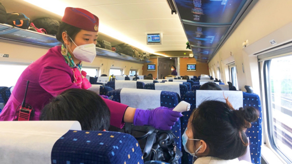 4、測溫:專列內幾乎滿座,餐飲等服務照常進行,乘務員定時為乘客測量體溫。