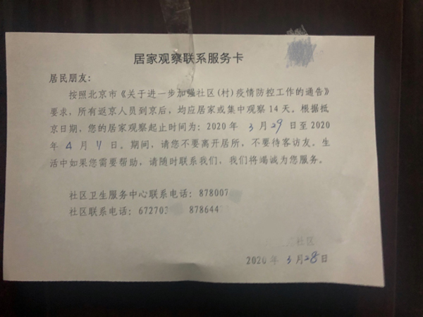 8、交接:車輛到達社區(qū)后,隨行的街道干部同社區(qū)工作人員進行交接。返京人員在測量體溫、簽署《居家觀察個人告知書》等文件后,由社區(qū)工作人員送至家中。居家觀察的14天內,將嚴格禁止外出、會客等行為,由社區(qū)安排專人幫助解決生活困難。