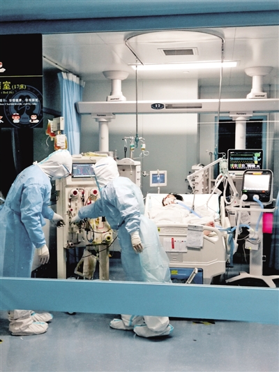 東院區(qū)重癥監(jiān)護(hù)室內(nèi),危重癥患者在接受人工肝治療。圖片由武漢大學(xué)人民醫(yī)院提供