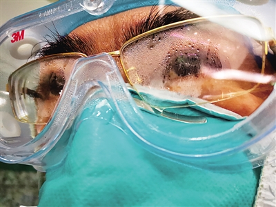 四層手套、三層防護(hù)服、口罩、防護(hù)鏡、面罩、正壓頭套……因?yàn)榇┐魈厥夥雷o(hù)設(shè)備,平常一臺5至10分鐘的手術(shù),現(xiàn)在要用3倍的時間來完成。