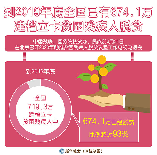 新華社北京3月31日電(記者孫少龍)中國(guó)殘聯(lián)、國(guó)務(wù)院扶貧辦、民政部31日在京召開(kāi)2020年助推貧困殘疾人脫貧攻堅(jiān)工作電視電話會(huì)。記者從會(huì)上了解到,到2019年底,全國(guó)719.3萬(wàn)建檔立卡貧困殘疾人中,674.1萬(wàn)已經(jīng)脫貧,比例超過(guò)93%。