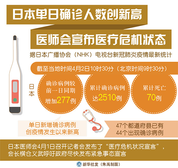 日本醫(yī)師會(huì)1日召開記者會(huì)指出日本一些地區(qū)病床不足,并發(fā)布了“醫(yī)療危機(jī)狀況宣言”。醫(yī)師會(huì)會(huì)長(zhǎng)橫倉(cāng)義武呼吁政府盡快發(fā)布緊急事態(tài)宣言。他說現(xiàn)在采取的對(duì)策要在兩周后才看到效果,等疫情暴發(fā)后就太晚了。