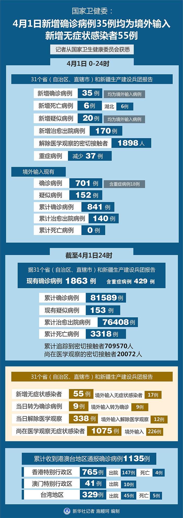 截至4月1日24時,據(jù)31個省(自治區(qū)、直轄市)和新疆生產(chǎn)建設(shè)兵團(tuán)報告,現(xiàn)有確診病例1863例(含重癥病例429例),現(xiàn)有疑似病例153例。累計確診病例81589例,累計治愈出院病例76408例,累計死亡病例3318例,累計追蹤到密切接觸者709570人,尚在醫(yī)學(xué)觀察的密切接觸者20072人。