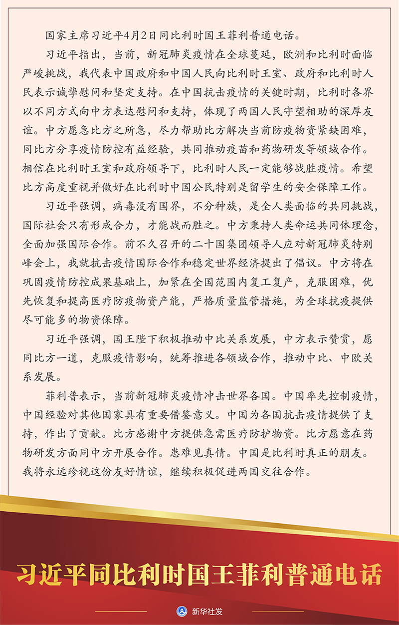 習(xí)近平指出,當(dāng)前,新冠肺炎疫情在全球蔓延,歐洲和比利時(shí)面臨嚴(yán)峻挑戰(zhàn),我代表中國政府和中國人民向比利時(shí)王室、政府和比利時(shí)人民表示誠摯慰問和堅(jiān)定支持。在中國抗擊疫情的關(guān)鍵時(shí)期,比利時(shí)各界以不同方式向中方表達(dá)慰問和支持,體現(xiàn)了兩國人民守望相助的深厚友誼。中方愿急比方之所急,盡力幫助比方解決當(dāng)前防疫物資緊缺困難,同比方分享疫情防控有益經(jīng)驗(yàn),共同推動疫苗和藥物研發(fā)等領(lǐng)域合作。相信在比利時(shí)王室和政府領(lǐng)導(dǎo)下,比利時(shí)人民一定能夠戰(zhàn)勝疫情。希望比方高度重視并做好在比利時(shí)中國公民特別是留學(xué)生的安全保障工作。