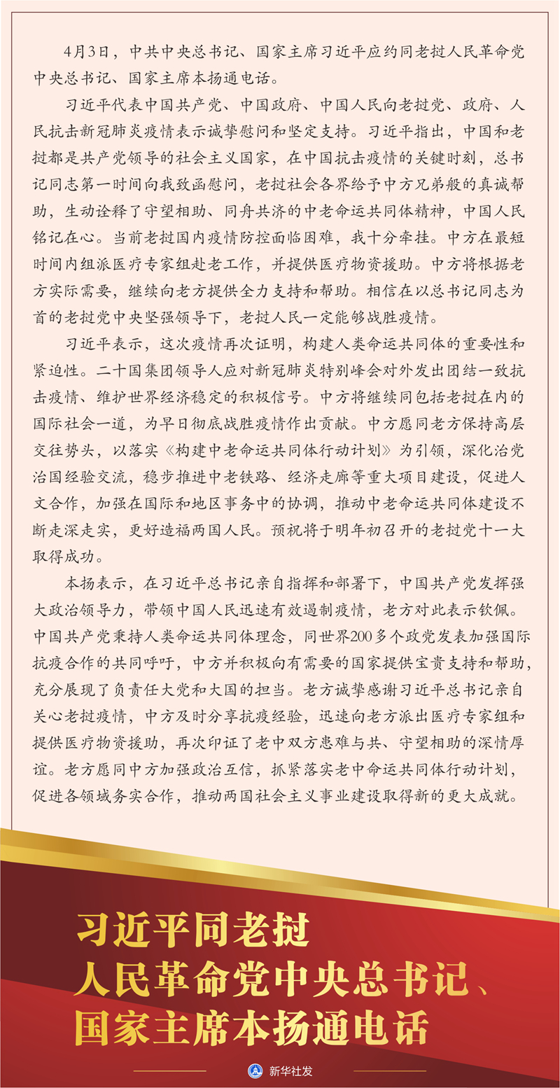 新華社北京4月3日電 4月3日,中共中央總書記、國家主席習近平應約同老撾人民革命黨中央總書記、國家主席本揚通電話。
