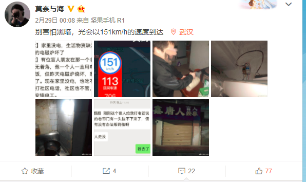 2月28日晚上10點(diǎn)多,樓威辰收到一項(xiàng)特殊的求助。一個(gè)獨(dú)居盲人張磊(化名)因電磁爐燒壞導(dǎo)致跳閘停電,無法做飯,打電話給社區(qū),社區(qū)說暫時(shí)沒法安排電工,只好通過朋友在網(wǎng)上求助。