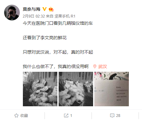2月8日,他送一個(gè)紅會(huì)志愿者去武漢市中心醫(yī)院,給李文亮醫(yī)生獻(xiàn)花。他在醫(yī)院門口看到幾輛殯儀館的車,門診大門前堆滿了花束,連院外圍欄也放了一排鮮花在地上,每束花都有一個(gè)小紙條,寄托著同一種情緒。