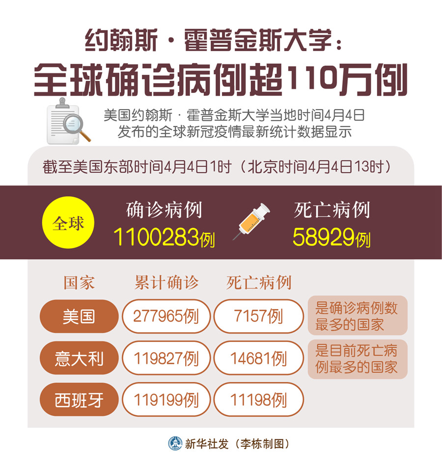 數(shù)據(jù)顯示,截至美國東部時(shí)間4日1時(shí)(北京時(shí)間4日13時(shí)),全球確診病例達(dá)1100283例,死亡病例為58929例。