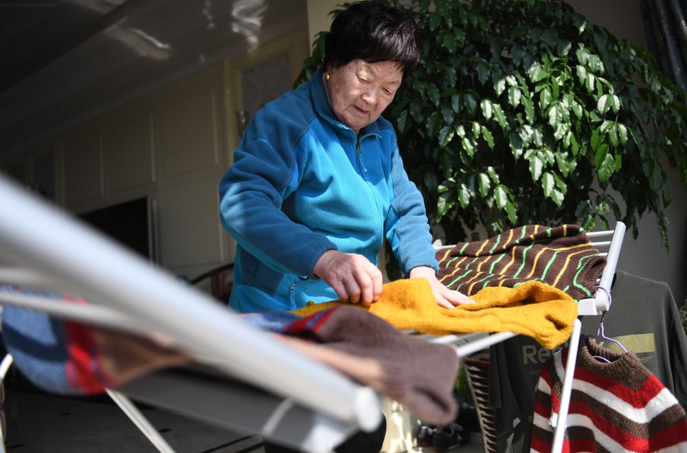 “毛衣奶奶”韓翠菊將新織的毛衣洗干凈后拿到陽臺上晾曬,她說一定要讓孩子們穿上的毛衣最干凈、最清爽(2月21日攝)。新華社發(fā)