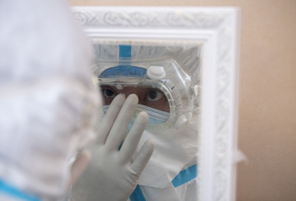 ↑3月13日晚,“擺渡人”小分隊(duì)隊(duì)員楊暉檢查護(hù)目鏡的佩戴情況。隊(duì)員的防護(hù)措施同重癥病房的醫(yī)生一樣,完成所有防護(hù)措施要經(jīng)過(guò)12個(gè)步驟。在華中科技大學(xué)同濟(jì)醫(yī)學(xué)院附屬同濟(jì)醫(yī)院光谷院區(qū),有很多生命“擺渡人”?!皵[渡人”日夜在醫(yī)院與醫(yī)院之間,留觀點(diǎn)與醫(yī)院之間穿梭不停,轉(zhuǎn)運(yùn)新冠肺炎患者。