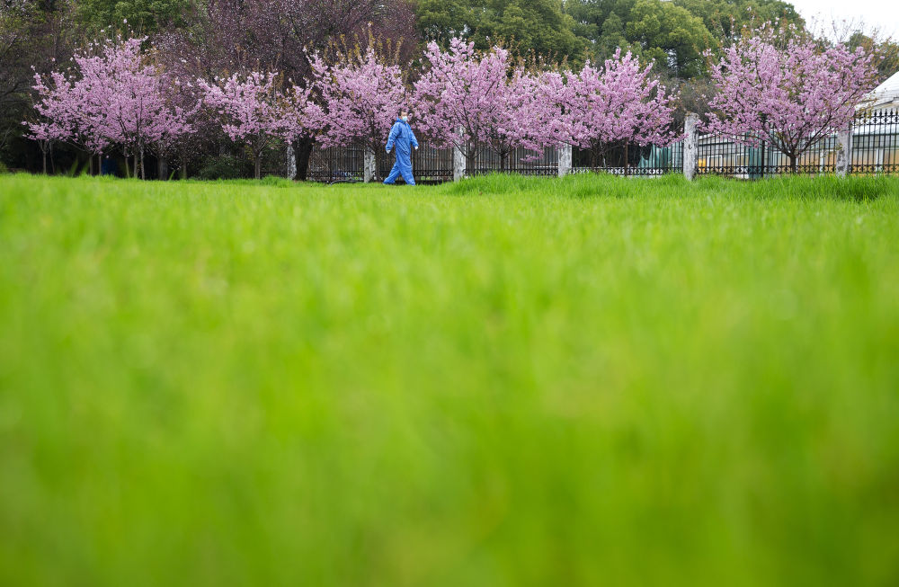 ↑3月3日,一名工作人員從盛開(kāi)的櫻花樹(shù)下走過(guò)。由于學(xué)校進(jìn)行封閉管理,我在這幾顆櫻花樹(shù)旁等了一個(gè)多小時(shí),只遇到了兩個(gè)人。