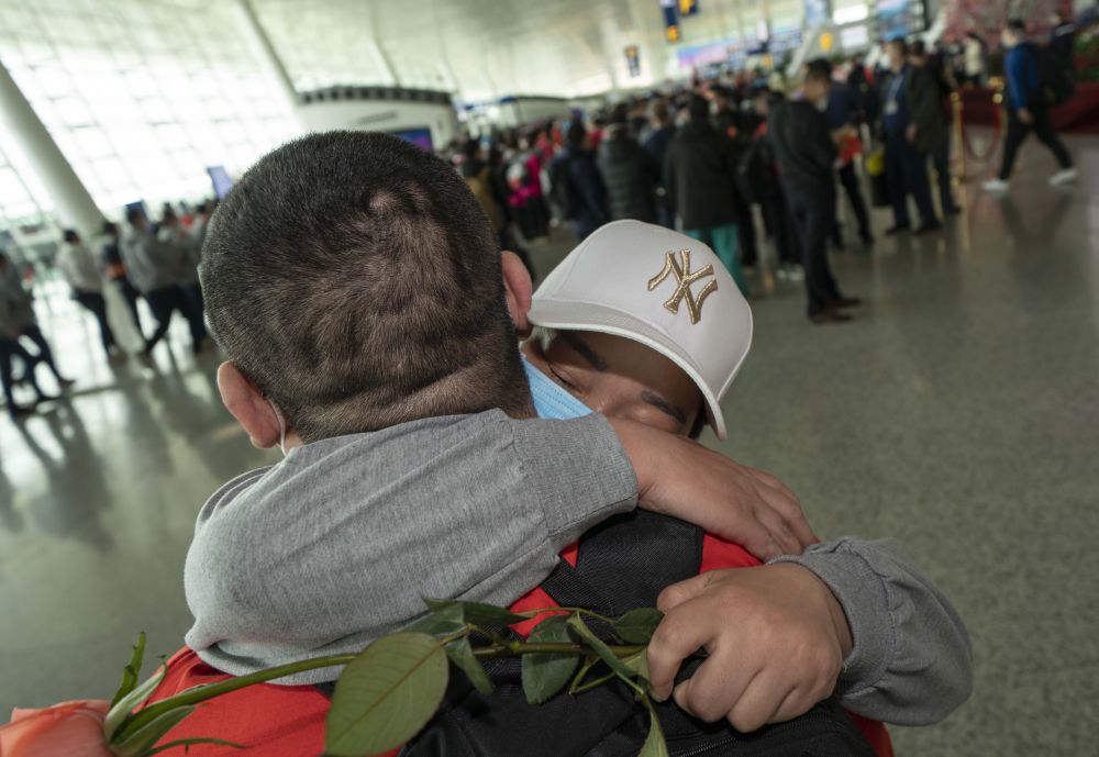 ↑3月19日,在武漢天河機(jī)場(chǎng),河南醫(yī)療隊(duì)隊(duì)員郭燕姿緊緊抱住丈夫王國(guó)曉。 夫妻二人都來(lái)自河南新鄉(xiāng),王國(guó)曉是醫(yī)生,郭燕姿是護(hù)士長(zhǎng)。2月9日,夫妻倆馳援武漢,隨后,郭燕姿被分配到青山方艙醫(yī)院工作,而王國(guó)曉則被分配到了另外一個(gè)區(qū)。從那以后,夫妻倆已有一個(gè)多月沒(méi)有見(jiàn)面。3月19日當(dāng)天,夫妻倆在機(jī)場(chǎng)重逢。
