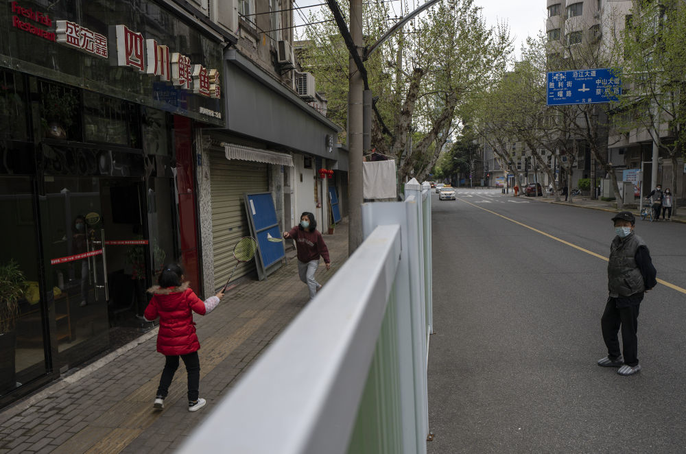 ↑4月1日,在武漢的一個(gè)社區(qū)里,人們?cè)诟綦x墻內(nèi)打打羽毛球。