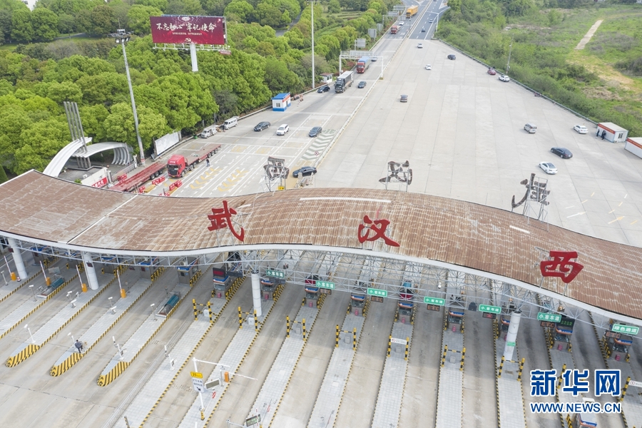 4月8日,車(chē)輛有序通過(guò)武漢西高速收費(fèi)站(無(wú)人機(jī)照片)。新華社記者 才揚(yáng) 攝