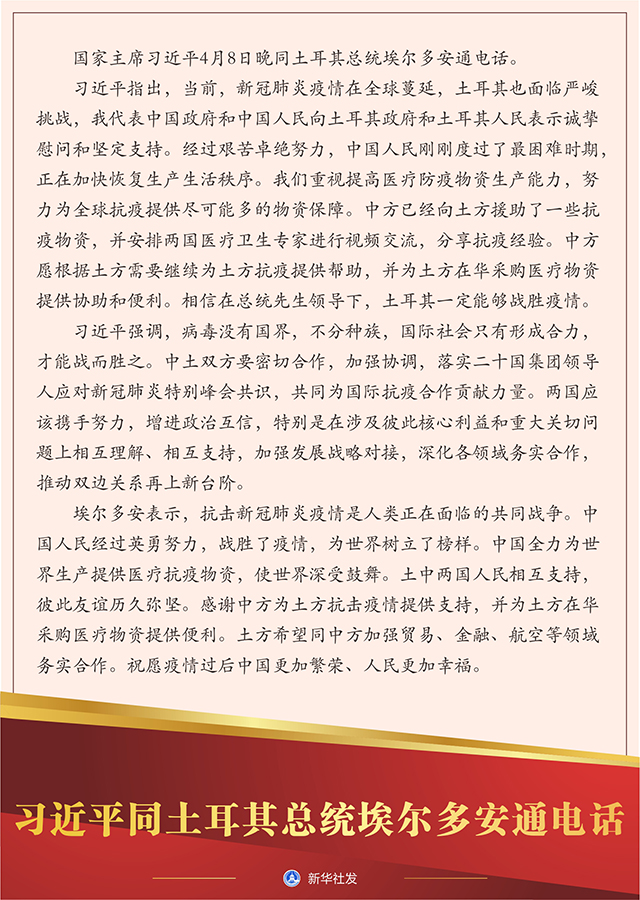 習(xí)近平指出,當(dāng)前,新冠肺炎疫情在全球蔓延,土耳其也面臨嚴(yán)峻挑戰(zhàn),我代表中國政府和中國人民向土耳其政府和土耳其人民表示誠摯慰問和堅定支持。經(jīng)過艱苦卓絕努力,中國人民剛剛度過了最困難時期,正在加快恢復(fù)生產(chǎn)生活秩序。我們重視提高醫(yī)療防疫物資生產(chǎn)能力,努力為全球抗疫提供盡可能多的物資保障。中方已經(jīng)向土方援助了一些抗疫物資,并安排兩國醫(yī)療衛(wèi)生專家進(jìn)行視頻交流,分享抗疫經(jīng)驗。中方愿根據(jù)土方需要繼續(xù)為土方抗疫提供幫助,并為土方在華采購醫(yī)療物資提供協(xié)助和便利。相信在總統(tǒng)先生領(lǐng)導(dǎo)下,土耳其一定能夠戰(zhàn)勝疫情。