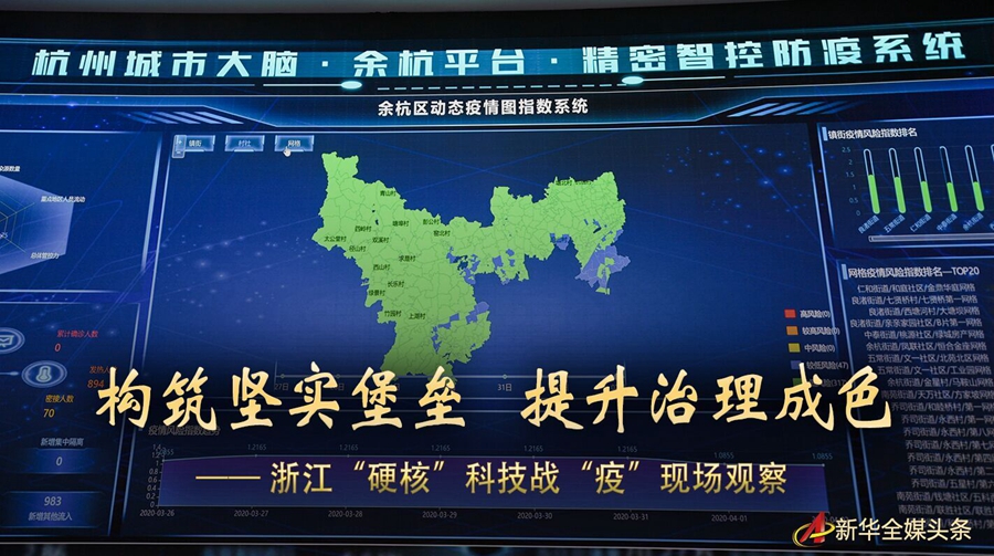 4月2日,在杭州市余杭區(qū)疫情防控工作領(lǐng)導(dǎo)小組指揮部內(nèi),杭州城市大腦精密智控防疫系統(tǒng)顯示疫情防控動態(tài)各項(xiàng)實(shí)時(shí)數(shù)據(jù)。新華社記者 徐昱 攝