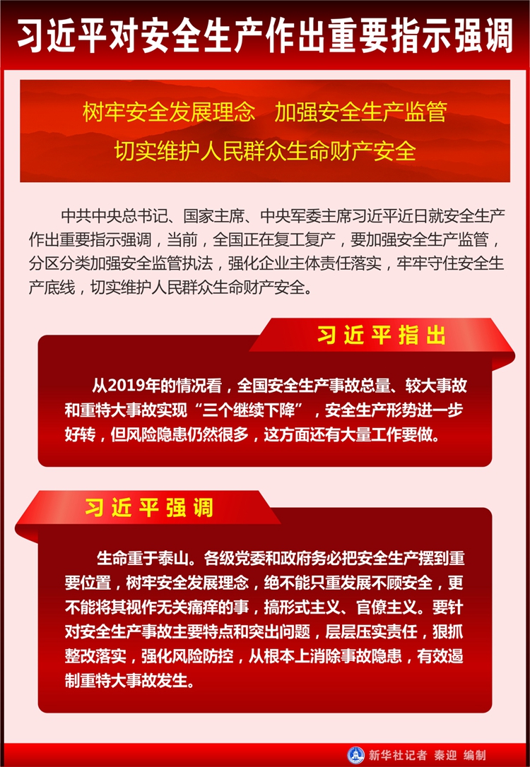 中共中央政治局常委、國務院總理李克強作出批示指出,當前,全國正處于統(tǒng)籌推進新冠肺炎疫情防控和復工復產的關鍵時期,安全生產意識和工作絲毫不能放松。各地區(qū)、各有關部門和各單位要堅持以習近平新時代中國特色社會主義思想為指導,認真貫徹落實黨中央、國務院決策部署,樹牢安全發(fā)展理念,層層壓實責任,深入排查各領域各環(huán)節(jié)安全生產隱患,全面開展安全生產專項整治三年行動,堅持系統(tǒng)治理、精準施策,扎實推進危險化學品、礦山、交通運輸、工業(yè)園、城市建設、危險廢物等重點領域安全整治,確保見到實效;加快建立健全安全生產責任和管理制度體系、隱患排查治理和風險防控體系,加強監(jiān)管執(zhí)法和安全服務,堅決遏制重特大事故發(fā)生,切實維護人民群眾生命財產安全。