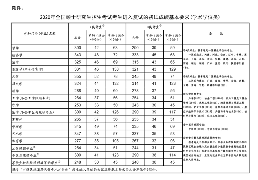 附件:2020年全國(guó)碩士研究生招生考試考生進(jìn)入復(fù)試的初試成績(jī)基本要求