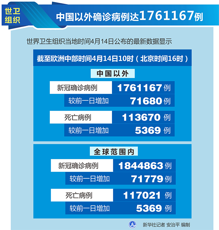 世衛(wèi)組織每日疫情報告顯示,截至歐洲中部時間14日10時(北京時間16時),中國以外新冠確診病例較前一日增加71680例,達(dá)到1761167例;中國以外死亡病例較前一日增加5369例,達(dá)到113670例。
