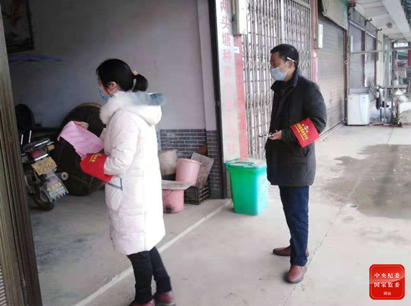 2月11日,向衛(wèi)煌和荷葉鎮(zhèn)兩頭塘村村干部上門向村民發(fā)放宣傳單,宣傳疫情防控知識。