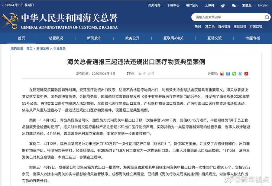 海關(guān)總署16日通報(bào)三起違法違規(guī)出口醫(yī)療物資典型案例,當(dāng)事人均涉嫌未向海關(guān)如實(shí)申報(bào),涉嫌逃避出口商品檢驗(yàn),受到立案調(diào)查或行政處罰。海關(guān)總署有關(guān)負(fù)責(zé)人表示,將采取多種聯(lián)合懲戒措施,讓違法者“一處失信,處處受限”。比如,企業(yè)被處罰的,海關(guān)將向商務(wù)主管部門通報(bào)企業(yè)被處罰信息,由其暫停企業(yè)的對(duì)外貿(mào)易經(jīng)營(yíng)活動(dòng),海關(guān)根據(jù)商務(wù)主管部門的決定對(duì)該企業(yè)的進(jìn)出口貨物不予辦理報(bào)關(guān)驗(yàn)放。(記者劉紅霞)