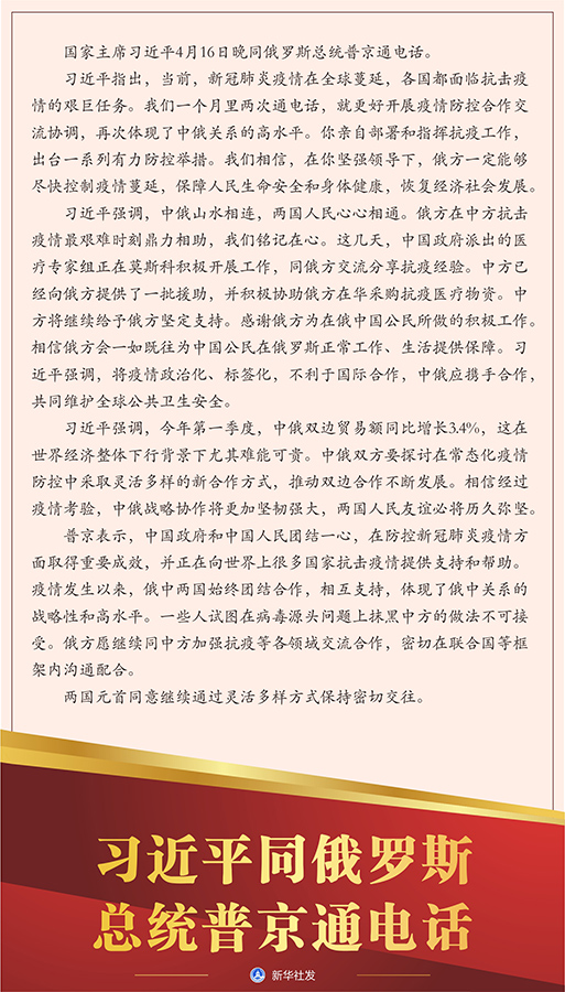 習(xí)近平指出,當(dāng)前,新冠肺炎疫情在全球蔓延,各國(guó)都面臨抗擊疫情的艱巨任務(wù)。我們一個(gè)月里兩次通電話,就更好開展疫情防控合作交流協(xié)調(diào),再次體現(xiàn)了中俄關(guān)系的高水平。你親自部署和指揮抗疫工作,出臺(tái)一系列有力防控舉措。我們相信,在你堅(jiān)強(qiáng)領(lǐng)導(dǎo)下,俄方一定能夠盡快控制疫情蔓延,保障人民生命安全和身體健康,恢復(fù)經(jīng)濟(jì)社會(huì)發(fā)展。