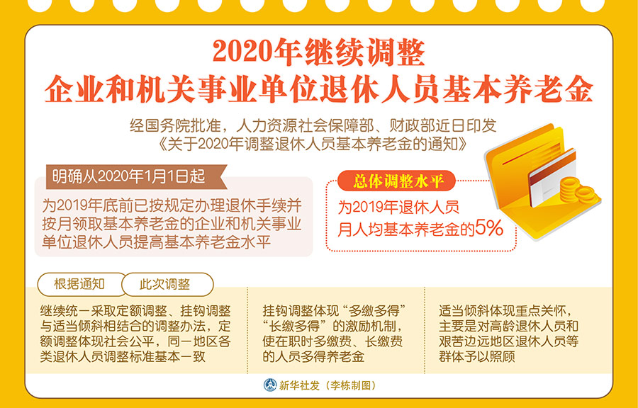 新華社北京4月17日電(記者王優(yōu)玲)經(jīng)國務(wù)院批準,人力資源社會保障部、財政部近日印發(fā)《關(guān)于2020年調(diào)整退休人員基本養(yǎng)老金的通知》,明確從2020年1月1日起,為2019年底前已按規(guī)定辦理退休手續(xù)并按月領(lǐng)取基本養(yǎng)老金的企業(yè)和機關(guān)事業(yè)單位退休人員提高基本養(yǎng)老金水平,總體調(diào)整水平為2019年退休人員月人均基本養(yǎng)老金的5%。