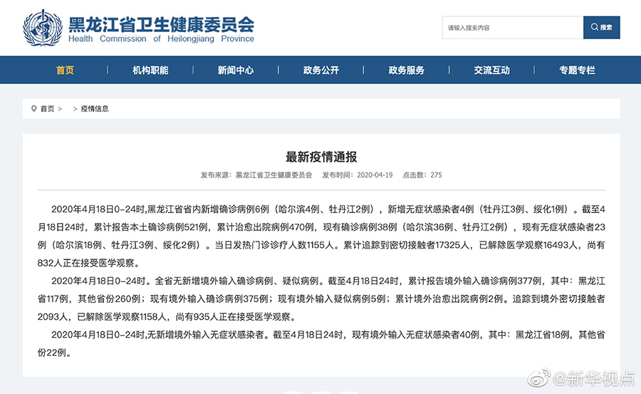 2020年4月18日0-24時,黑龍江省省內(nèi)新增確診病例6例(哈爾濱4例、牡丹江2例),新增無癥狀感染者4例(牡丹江3例、綏化1例)。截至4月18日24時,累計(jì)報告本土確診病例521例,累計(jì)治愈出院病例470例,現(xiàn)有確診病例38例(哈爾濱36例、牡丹江2例),現(xiàn)有無癥狀感染者23例(哈爾濱18例、牡丹江3例、綏化2例)。當(dāng)日發(fā)熱門診診療人數(shù)1155人。累計(jì)追蹤到密切接觸者17325人,已解除醫(yī)學(xué)觀察16493人,尚有832人正在接受醫(yī)學(xué)觀察。
