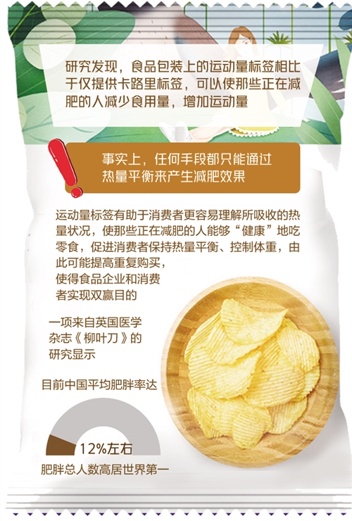 據(jù)了解,為了讓消費者更容易理解所吸收的熱量狀況并促進健康飲食習慣,英國皇家公共健康協(xié)會曾呼吁,在食品包裝上引入運動熱量標簽,告訴消費者要消耗掉食物所含熱量需要進行多長時間和什么強度的運動。