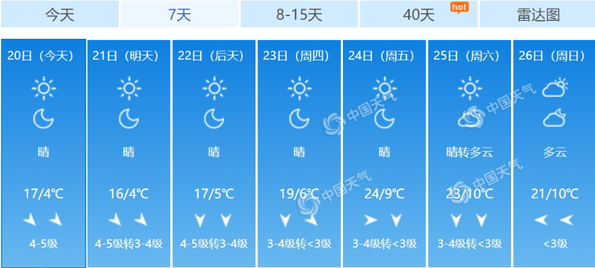 今天,北京依然是北風勁吹的一天,根據(jù)市氣象臺今晨6時發(fā)布的預報,今天白天,北京晴,北風4~5級(陣風7~8級),最高氣溫17℃;夜間晴,北風4級左右,最低氣溫4℃。