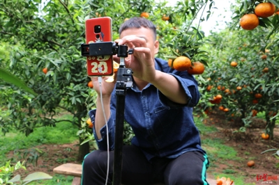 肖欽仁在自家橘子地里作直播