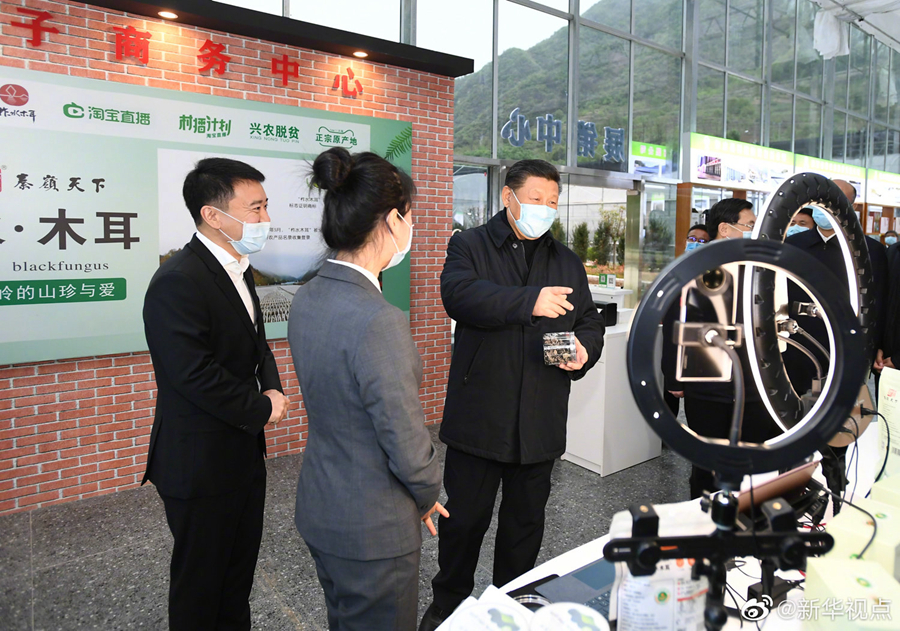 正在陜西考察的習近平總書記20日下午來到柞水縣小嶺鎮(zhèn)金米村。金米村地處秦嶺深處,近年來依靠發(fā)展木耳等產業(yè)擺脫了貧困。村培訓中心,幾位村民正在做網(wǎng)上直播賣貨的準備工作,總書記走到直播平臺前,同他們親切交談起來。他表示,電商作為新興業(yè)態(tài),既可以推銷農副產品、幫助群眾脫貧致富,又可以推動鄉(xiāng)村振興,是大有可為的。(文字記者:張曉松 攝影記者:鞠鵬、謝環(huán)馳、燕雁、翟健嵐)