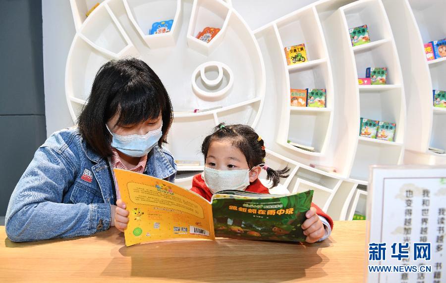 4月22日,一對母女在湖北省襄陽市??悼h一家書店內(nèi)閱讀少兒讀物。新華社發(fā)(陳泉霖 攝)