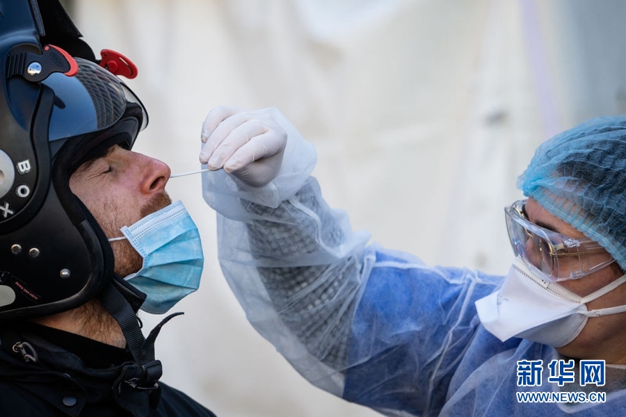 4月1日,在法國巴黎17區(qū),工作人員為一名接受新冠病毒檢測的醫(yī)護人員取樣。新華社發(fā)(奧雷利安·莫里薩爾攝)