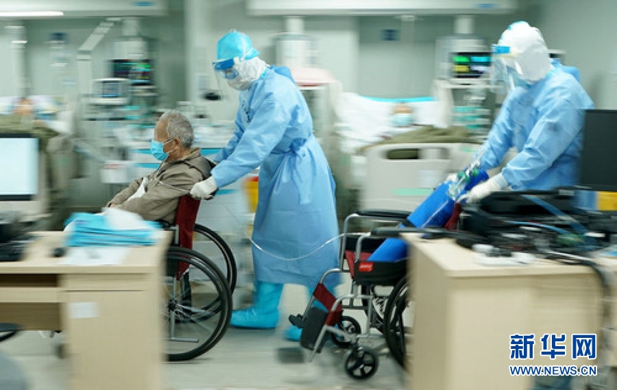 3月20日,武漢火神山醫(yī)院重癥醫(yī)學(xué)一科副主任宋立強(中)護送81歲的新冠肺炎重癥患者去做CT檢查。為確保患者有充足供氧,醫(yī)生胡世頡推著氧氣瓶隨行。新華社記者 王毓國 攝