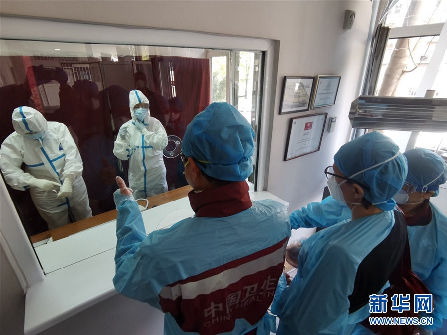 4月11日,在塞爾維亞首都貝爾格萊德,中國赴塞爾維亞抗疫醫(yī)療專家組在貝爾格萊德一所門診走訪,為醫(yī)護人員的防護意識點贊。新華社發(fā)(中國赴塞爾維亞抗疫醫(yī)療專家組供圖)