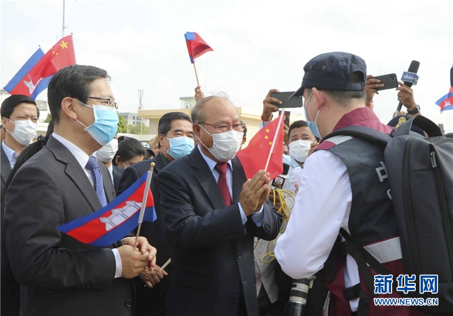 3月23日,在柬埔寨首都金邊,柬埔寨衛(wèi)生大臣曼本亨(中)在機場迎接中國抗疫醫(yī)療專家組。新華社記者 毛鵬飛 攝