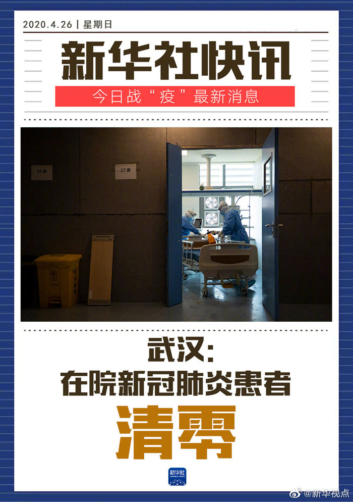 當日下午在北京舉行的國務院聯(lián)防聯(lián)控機制新聞發(fā)布會上,國家衛(wèi)生健康委新聞發(fā)言人米鋒也介紹說,經(jīng)過武漢和全國援鄂醫(yī)務人員的共同努力,至26日,武漢在院新冠肺炎患者清零。