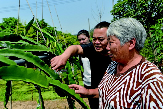 4月26日,廈門海滄青礁村院前社理事長陳俊雄(中)在指導(dǎo)村民種植火龍果。 照片均由本報(bào)記者魏培全拍攝
