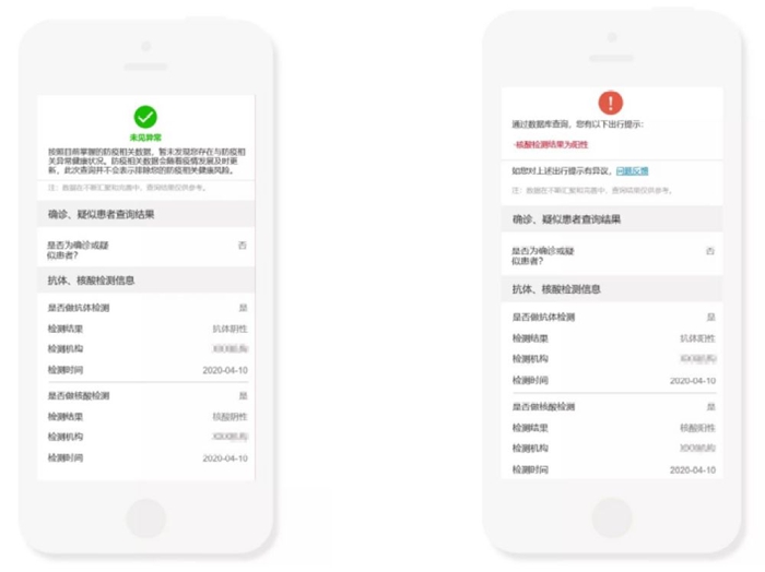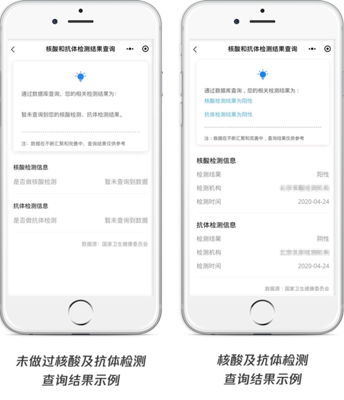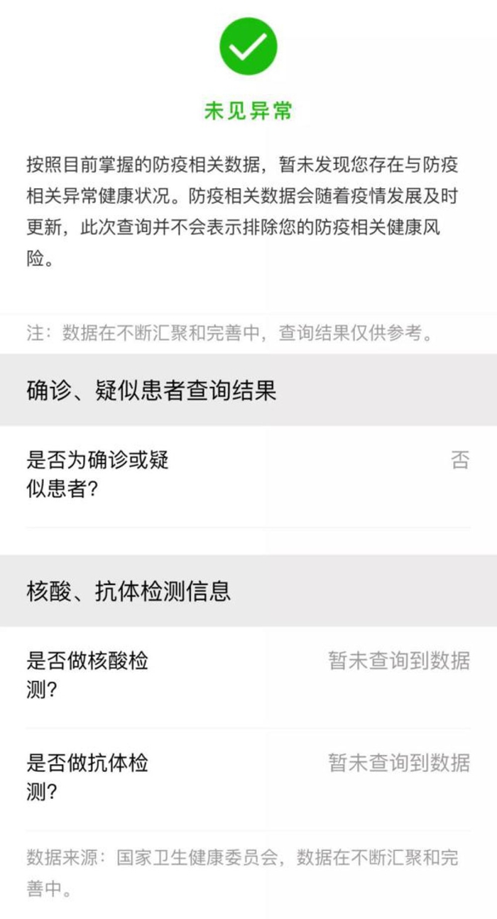 此外,核酸和抗體檢測(cè)結(jié)果信息還納入了全國(guó)一體化平臺(tái)“防疫健康信息碼”服務(wù)。用戶可通過(guò)國(guó)家政務(wù)服務(wù)平臺(tái)微信、支付寶、百度小程序,根據(jù)操作指引申領(lǐng)國(guó)家平臺(tái)的“防疫健康信息碼”,“防疫健康信息碼”會(huì)如實(shí)反映本人7天內(nèi)核酸及抗體檢測(cè)結(jié)果。如核酸檢測(cè)結(jié)果為陰性,則防疫健康風(fēng)險(xiǎn)狀態(tài)顯示“未見(jiàn)異?!薄H绾怂釞z測(cè)結(jié)果為陽(yáng)性,則會(huì)出現(xiàn)“核酸檢測(cè)結(jié)果為陽(yáng)性”的出行提示。如果7天內(nèi)未做過(guò)核酸及抗體檢測(cè),防疫健康信息會(huì)根據(jù)個(gè)人當(dāng)前提供的相關(guān)數(shù)據(jù)顯示健康風(fēng)險(xiǎn)結(jié)果。